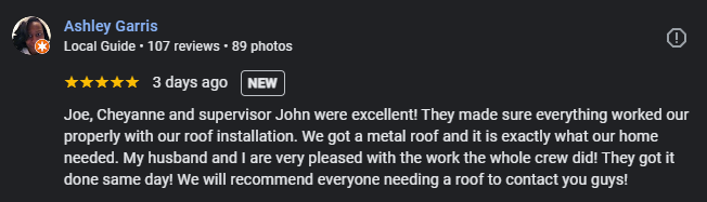 Joe, Cheyanne and supervisor John were excellent! They made sure everything worked our properly with our roof installation. We got a metal roof and it is exactly what our home needed. My husband and I are very pleased with the work the whole crew did! They got it done same day! We will recommend everyone needing a roof to contact you guys!