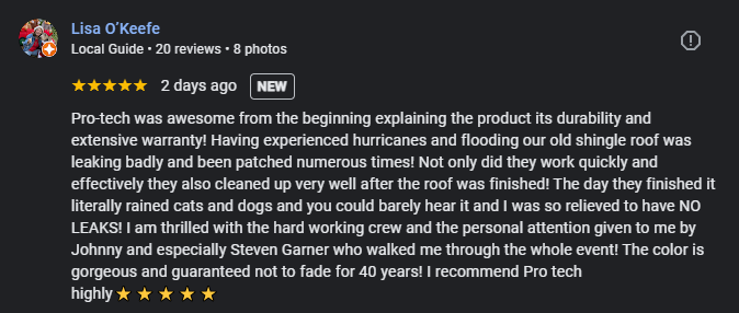 Pro-tech was awesome from the beginning explaining the product its durability and extensive warranty! Having experienced hurricanes and flooding our old shingle roof was leaking badly and been patched numerous times! Not only did they work quickly and effectively they also cleaned up very well after the roof was finished! The day they finished it literally rained cats and dogs and you could barely hear it and I was so relieved to have NO LEAKS! I am thrilled with the hard working crew and the personal attention given to me by Johnny and especially Steven Garner who walked me through the whole event! The color is gorgeous and guaranteed not to fade for 40 years! I recommend Pro tech highly ⭐⭐⭐⭐⭐