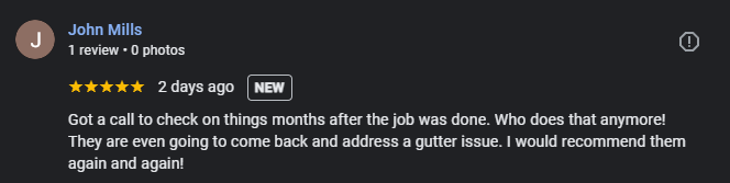 Got a call to check on things months after the job was done. Who does that anymore! They are even going to come back and address a gutter issue. I would recommend them again and again!